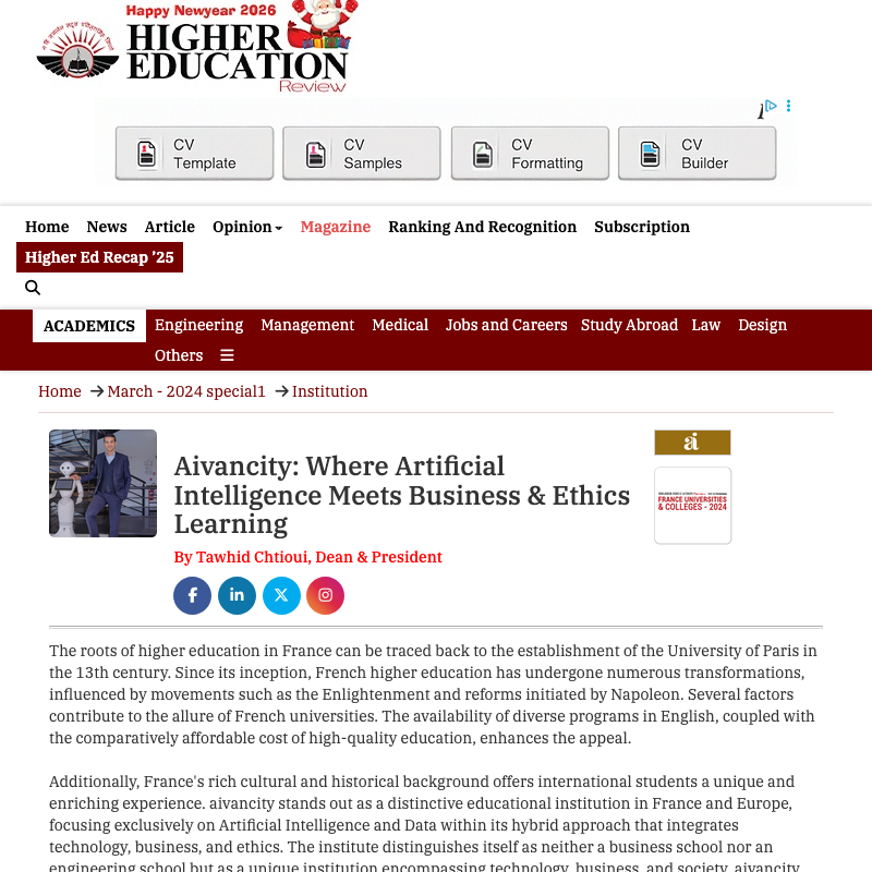The Higher Education Review has spotlighted Aivancity in its latest feature, recognizing it as a distinctive educational institution in France and Europe. The report highlights Aivancity’s unique position where Artificial Intelligence meets business and ethics learning.