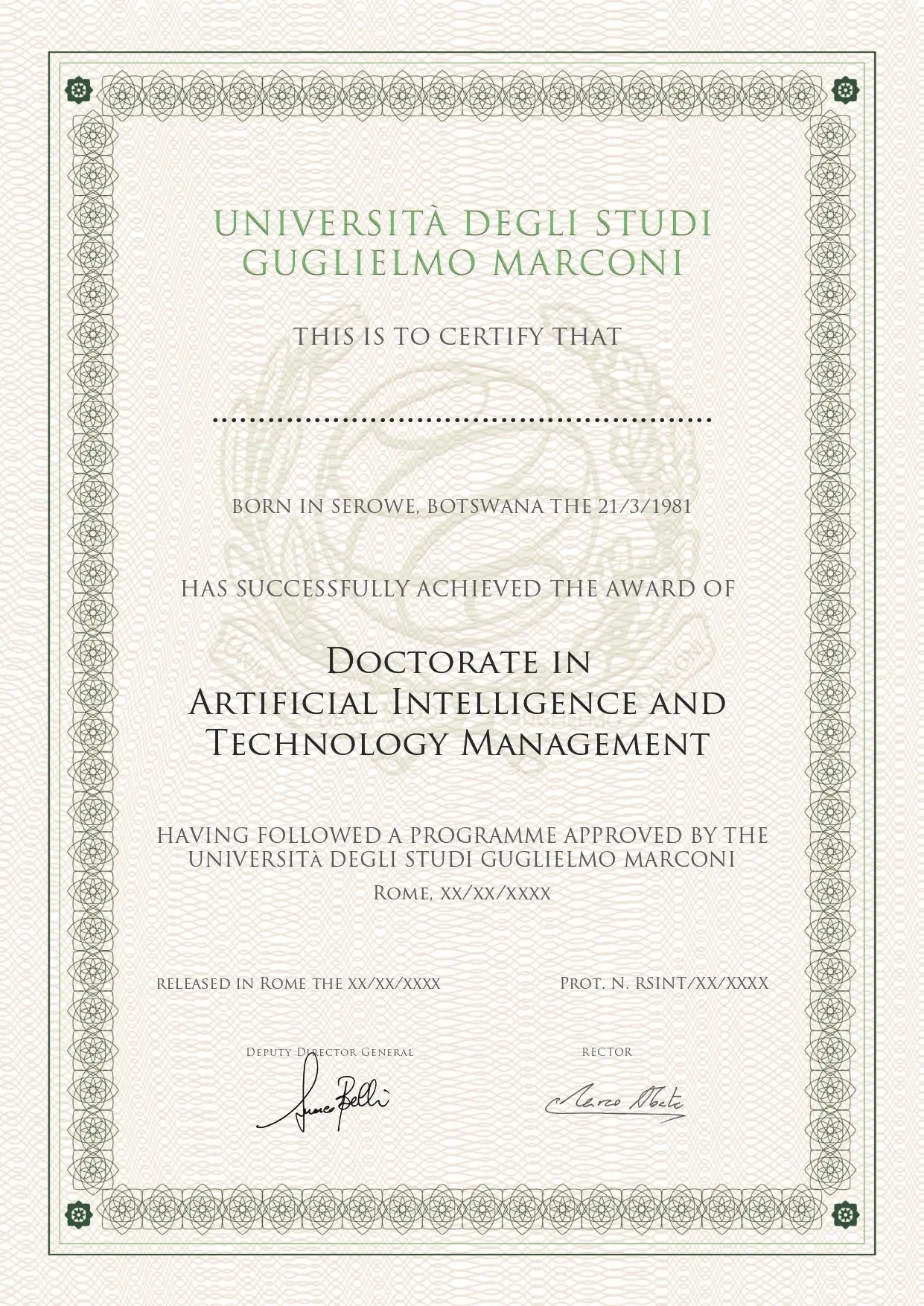You’ll earn three international qualifications: a Doctoral Degree and Master of Research in Artificial intelligence and Technology Management from Guglielmo Marconi University (Italy) and CMI Certification from the Chartered Management Institute.