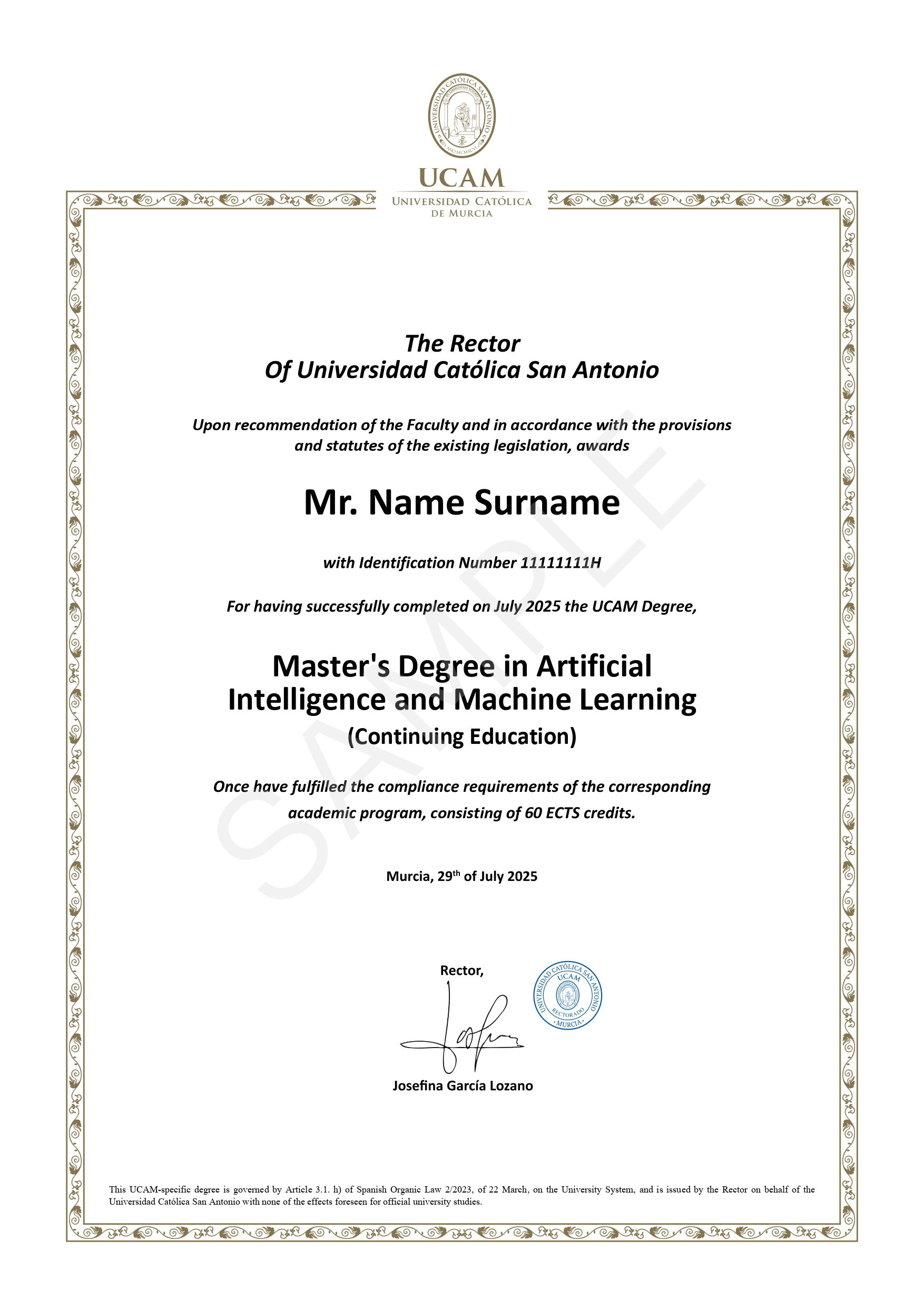 You’ll receive a Master’s degree in Artificial Intelligence and Machine Learning from Universidad Católica de Murcia (UCAM), Spain – a fully accredited European university. This degree can be attested in most nations and accepted for academic validation globally.