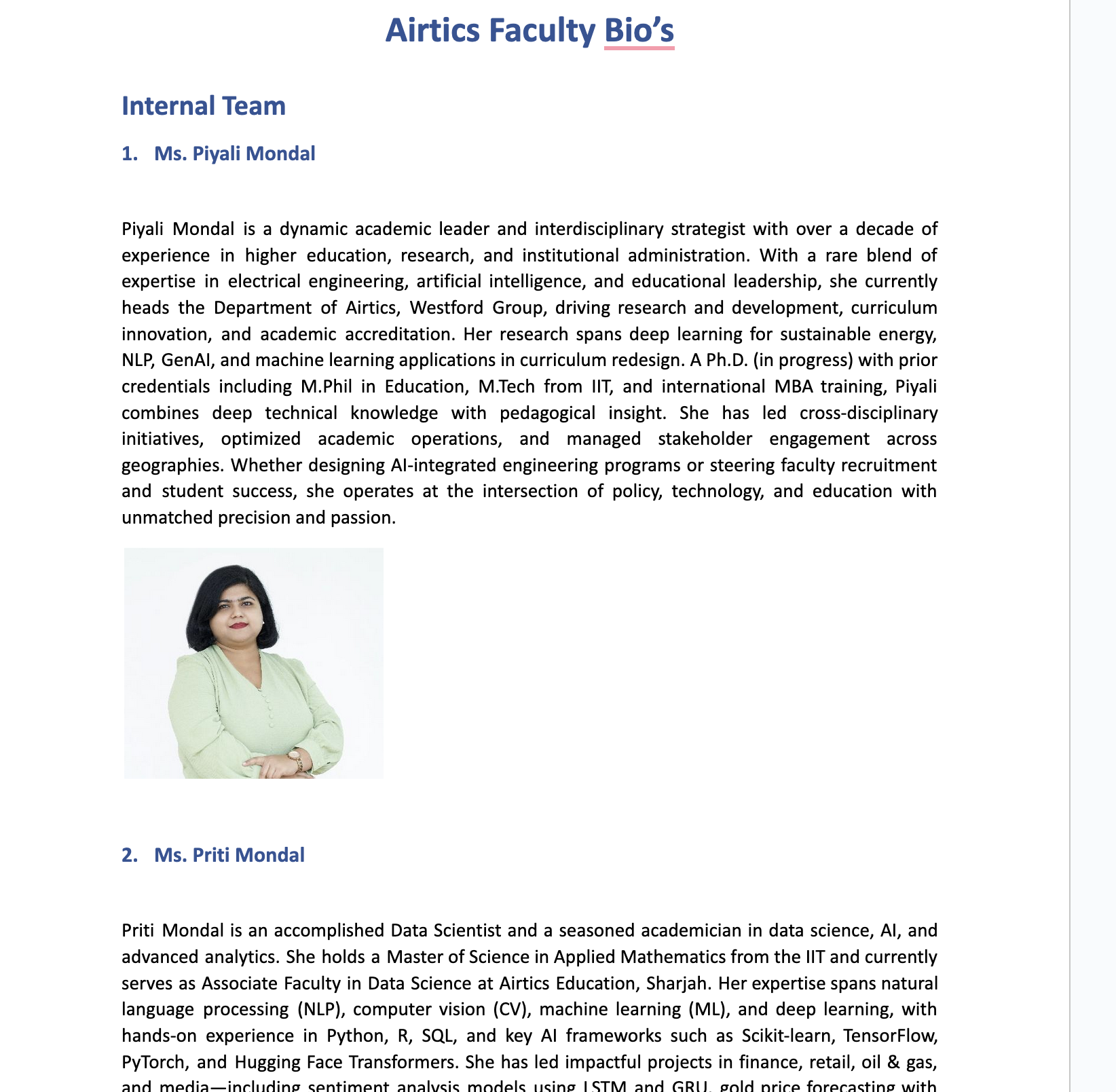 Airtics’ faculty pool is led by Ms. Piyali Mondal and includes a host of expert external faculty members and mentors. All faculty members are highly experienced subject matter experts. Moreover, the Airtics academic division is overseen by Dr. Vivek Mohan (Dean, Exeed College) to ensure quality assurance and student welfare.
